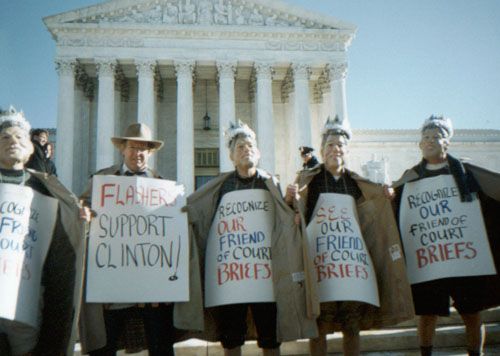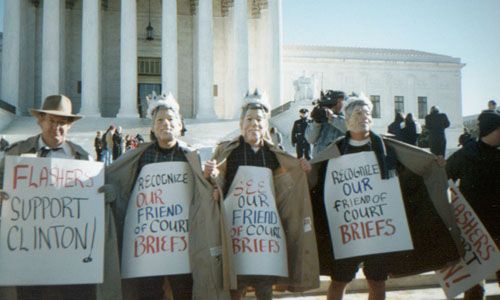 Paula Jones case moves forward. Flashers for Clinton at Supreme Court on day of 9-0 decision.