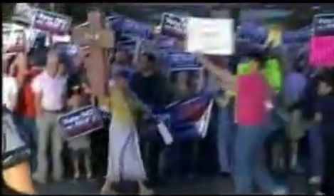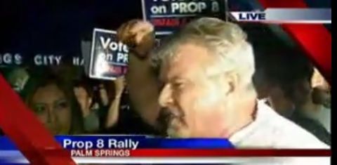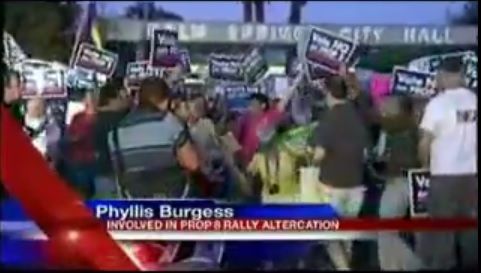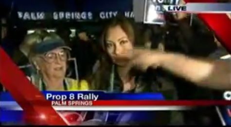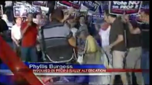 Here are stills from the video linked below. An angry and rabid anti-Proposition 8 mob attacks a peaceful protester, who in this case is an elderly woman.