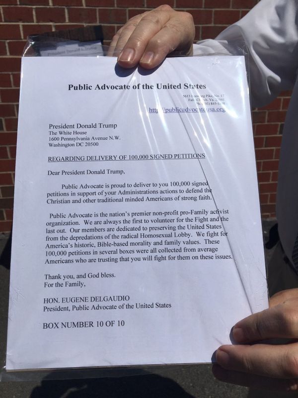 "Public Advocate is proud to deliver to you 100,000 signed petitions in support of your Administrations actions to defend the Christian and other traditional minded Americans of strong faith.