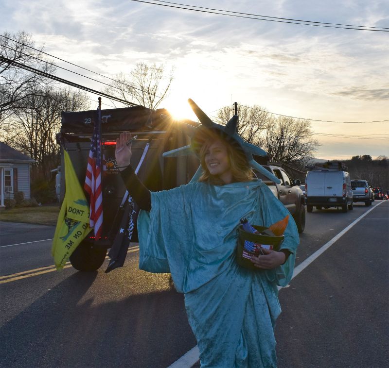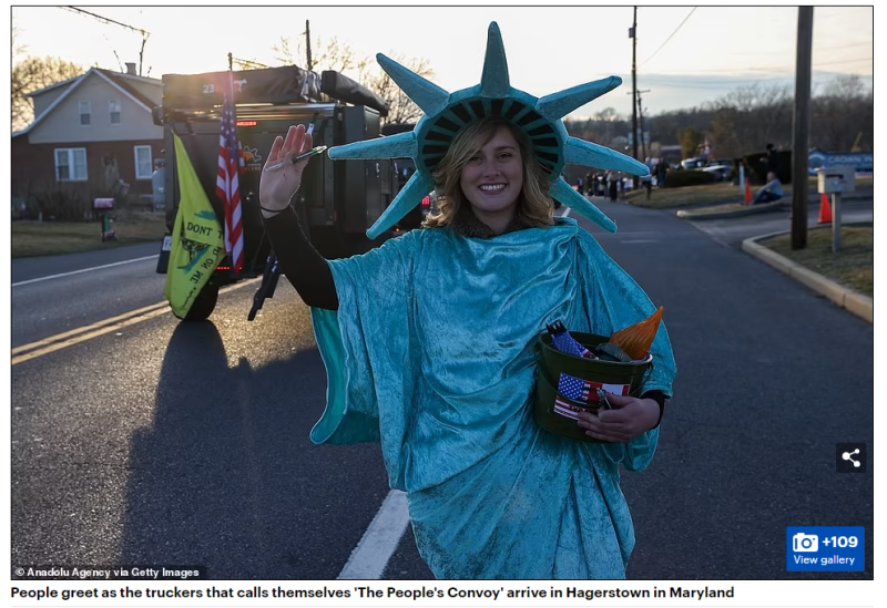 Lady Liberty volunteer dressed as the Statue of Liberty welcomes Trucker Convoy -
