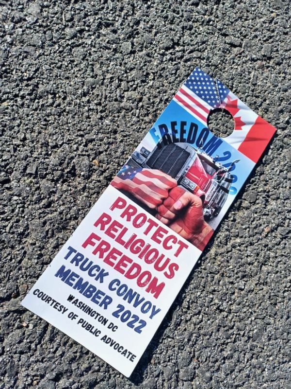 Handing out special Protect Religious Freedom Convoy Member car mirror Tags -