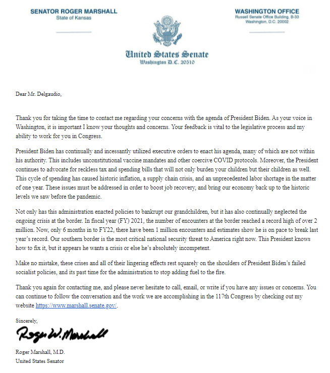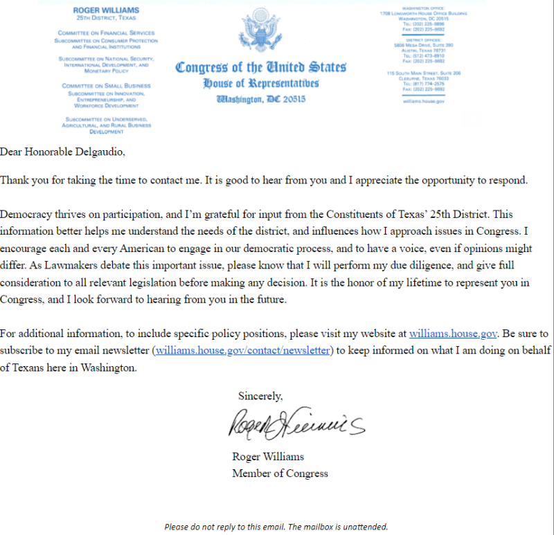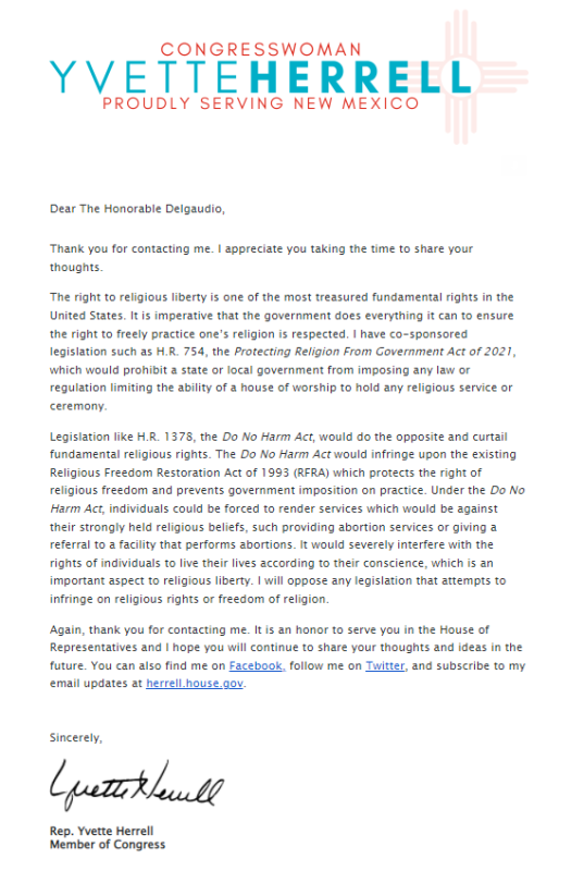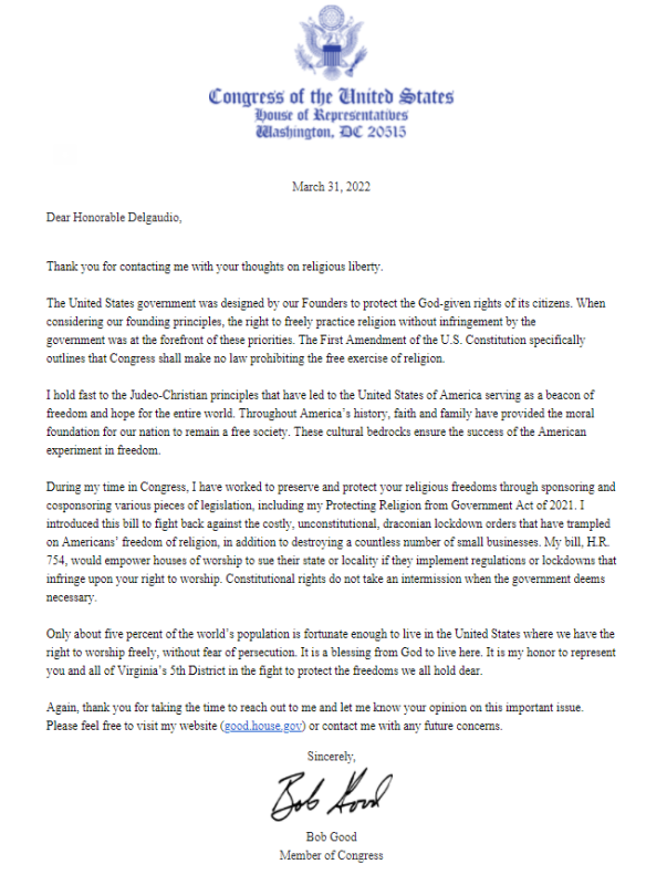 Responses from Congress and Senate Regarding standing for Religious Freedom & th...