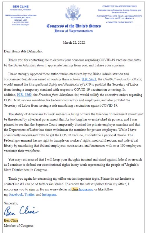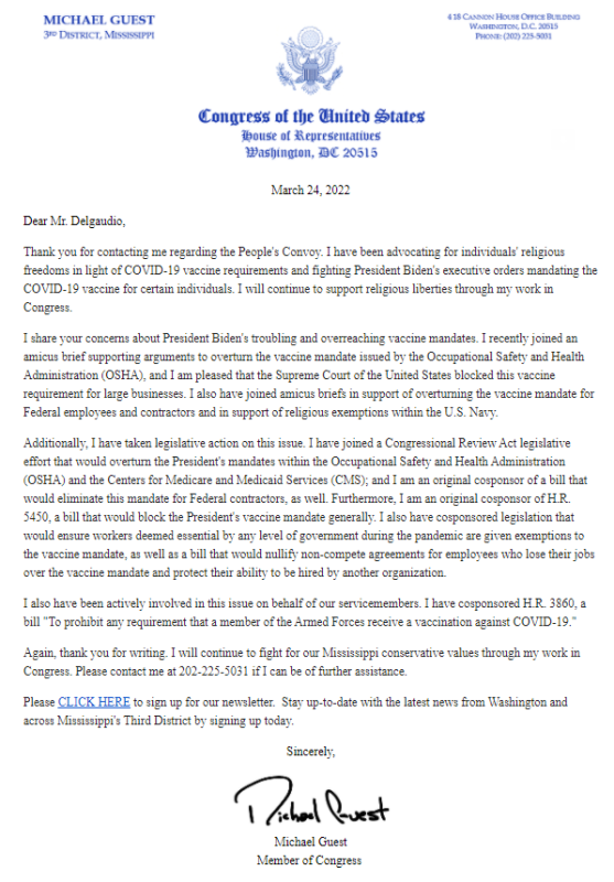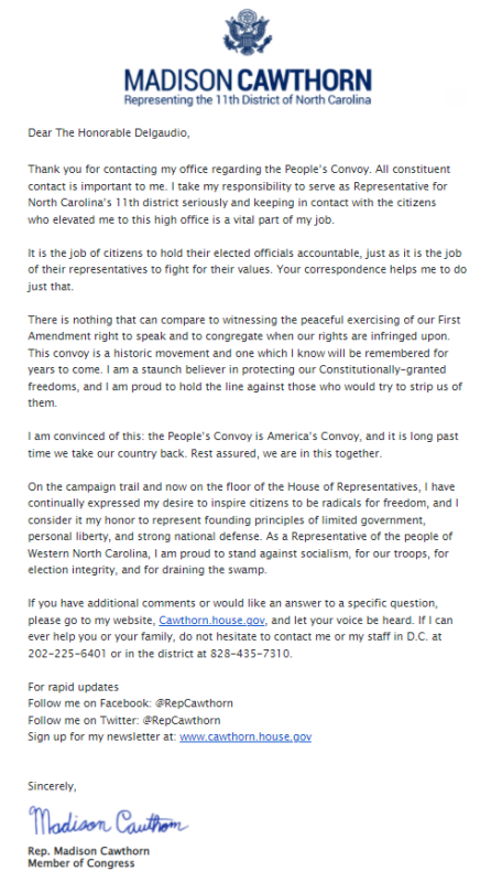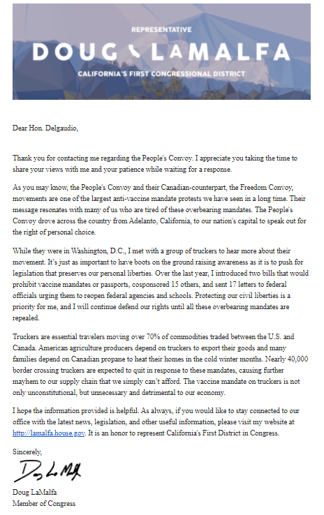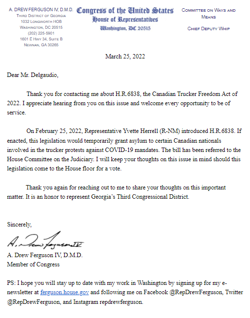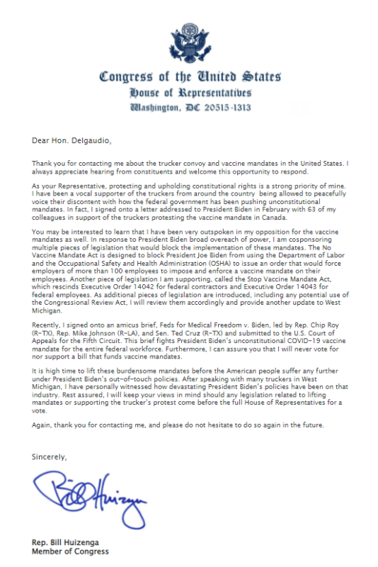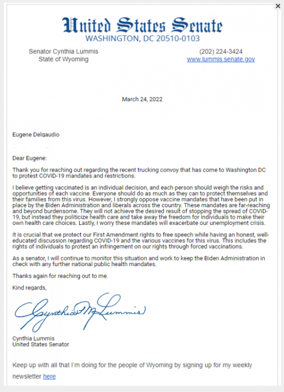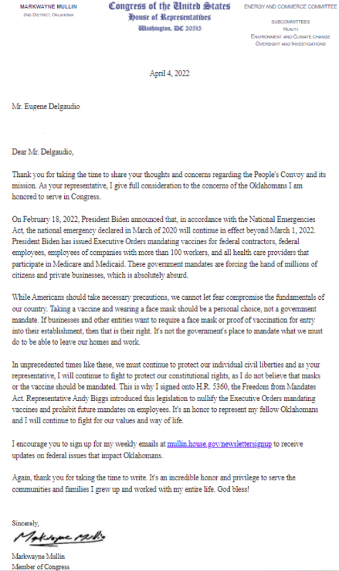 Responses from Congress and Senate Regarding standing for Religious Freedom & the Truckers Peoples Convoy